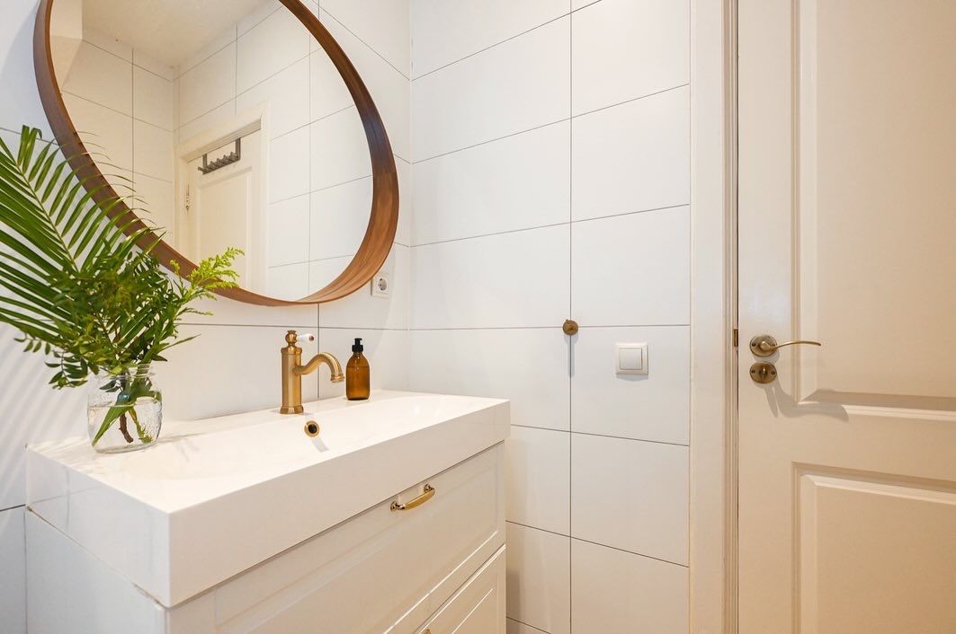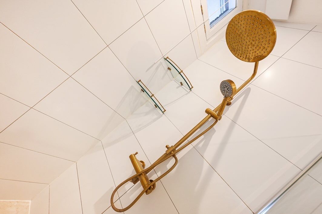 In Den Haag is een kleine badkamer omgetoverd tot een frisse praktische badkamer met luxe messing accenten. Onze vakmannen hebben zowel het sloopwerk opgepakt als het opbouwen en afwerken van de badkamer (leidingwerk, tegelwerk en montage).